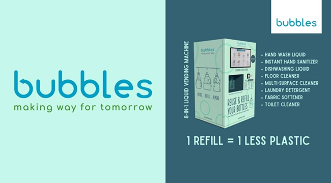 为了提倡环保和达到减少塑料垃圾,Bubbles推出全马第一台的清洁剂自动贩卖机(self-service cleaning liquid vending machine),它旨在协助消费者轻松重复使用塑料瓶罐。