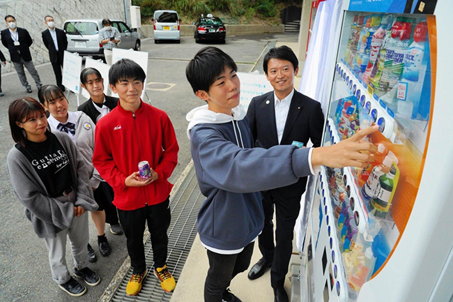 14日,兵库县知事齐藤参观了兵库县立高中,斋藤知事亲自将宣传广告贴在自动贩卖机上。