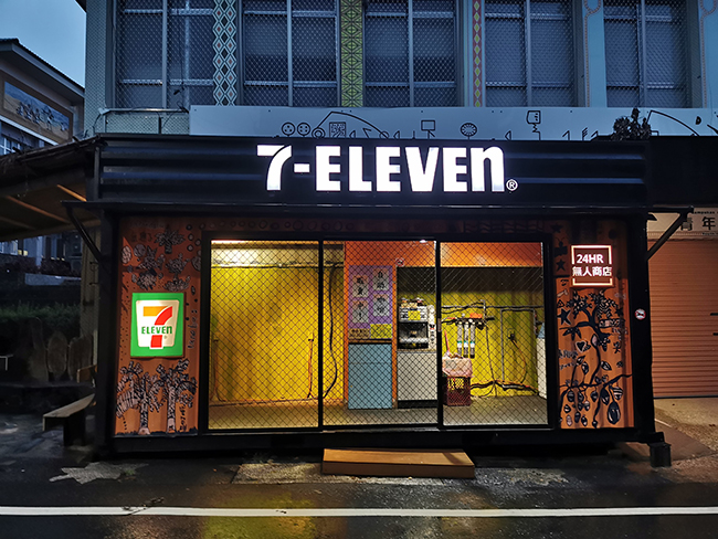 延平乡公所在延平乡青创基地外,以货柜屋设“7-ELEVEN”自动贩卖机24小时无人超商,为让无人店贴近部落、符合地方文化意象,邀请当地艺术家、工艺家,将货柜屋三面墙以布农族的元素做设计。