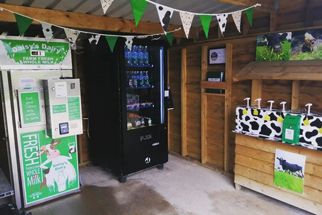 除了我们的牛奶自动售货机,我们还购买了一台Jofemar瓶装/农产品机,人们可以在这里购买500毫升和1升可重复使用的玻璃瓶、附近农场的鸡蛋、奶酪、黄油、当地蜂蜜和小吃。