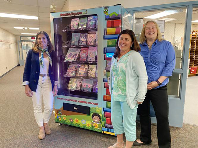 二年级学生布里吉特·麦克纳马拉、四年级学生夏洛特·麦克纳马拉和诺亚·哈迪以及五年级学生克里斯托弗·佩克是第一批使用新英奇书虫自动售货机的人。