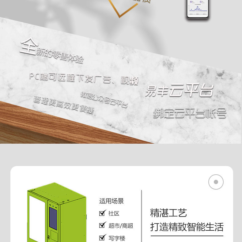 新款易丰EV7789SY-10ET2是一款多功能智能自动售药机,采用智能化管理系统,可轻松设定商品销售价格,具备故障自诊断等管理功能,方便运营用户使用。