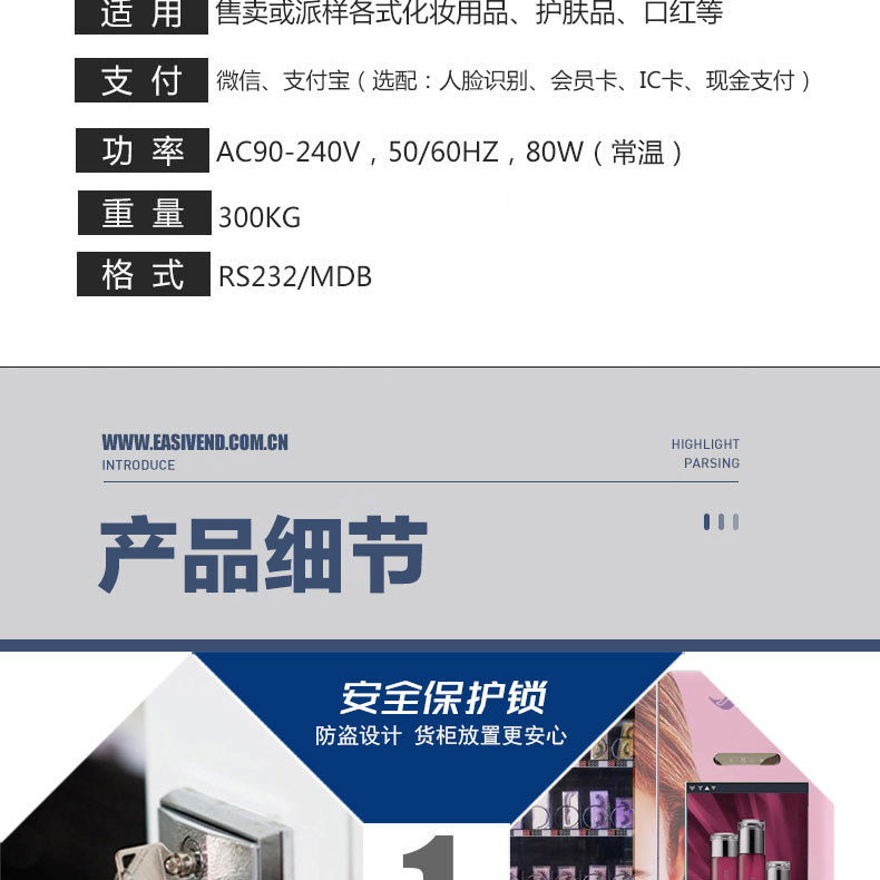 产品型号:EV7632S-8 刷脸支付综合自动售货机,48货道大容量,10寸安卓触屏,适合售卖零食、瓶装或听装饮料等可以冷藏的食品