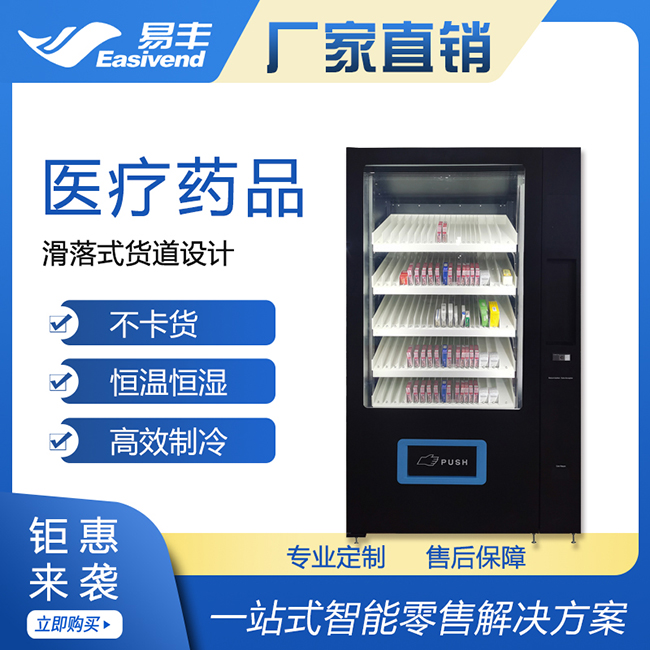 骏鹏易丰定制款自动售药机产品特点:滑落式货道设计,掉落式出货,不卡货,恒温恒湿系统,可根据客户需求定制, 支持售卖各类药品、计生用品、化妆品等各式盒装商品