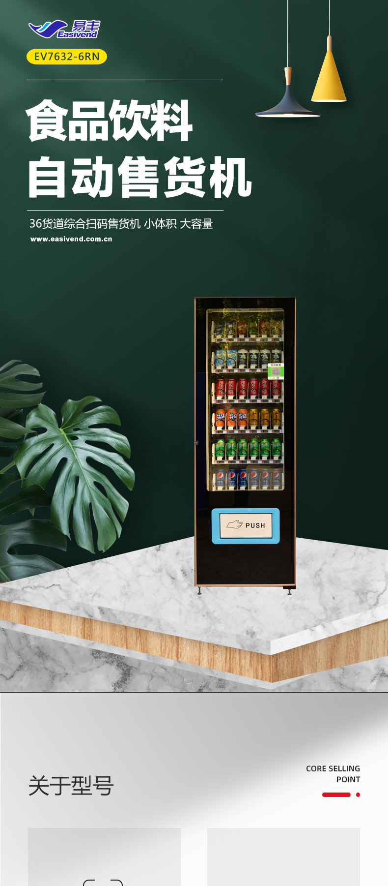 产品型号:EV7536-10 10寸触屏式食品饮料自动售货机,60货道大容量,约可售卖400件商品(具体视商品大小而定)一体发泡机箱,适合售卖零食、瓶装或听装饮料等可以冷藏的商品