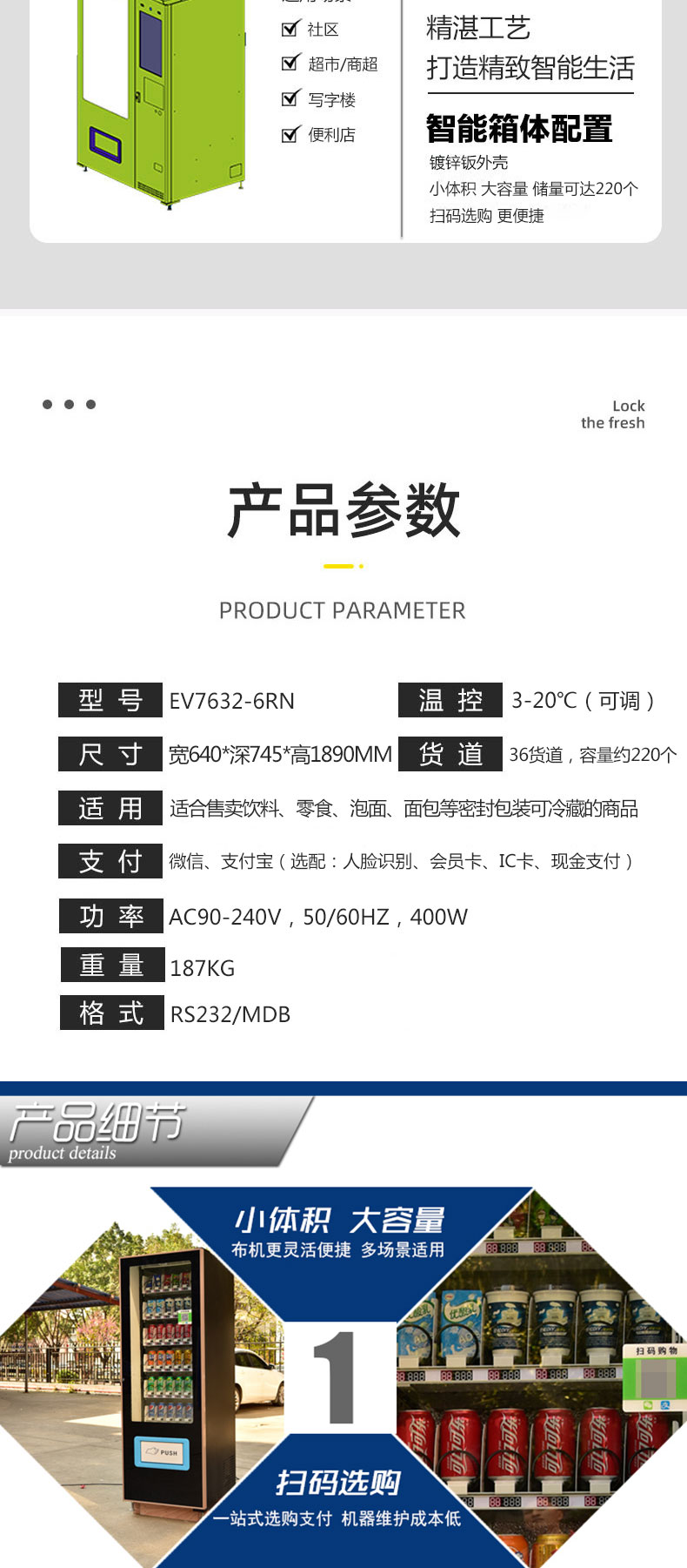 产品型号:EV7632-10R食品饮料综合售货机(60货道纯扫码型自动售货机)