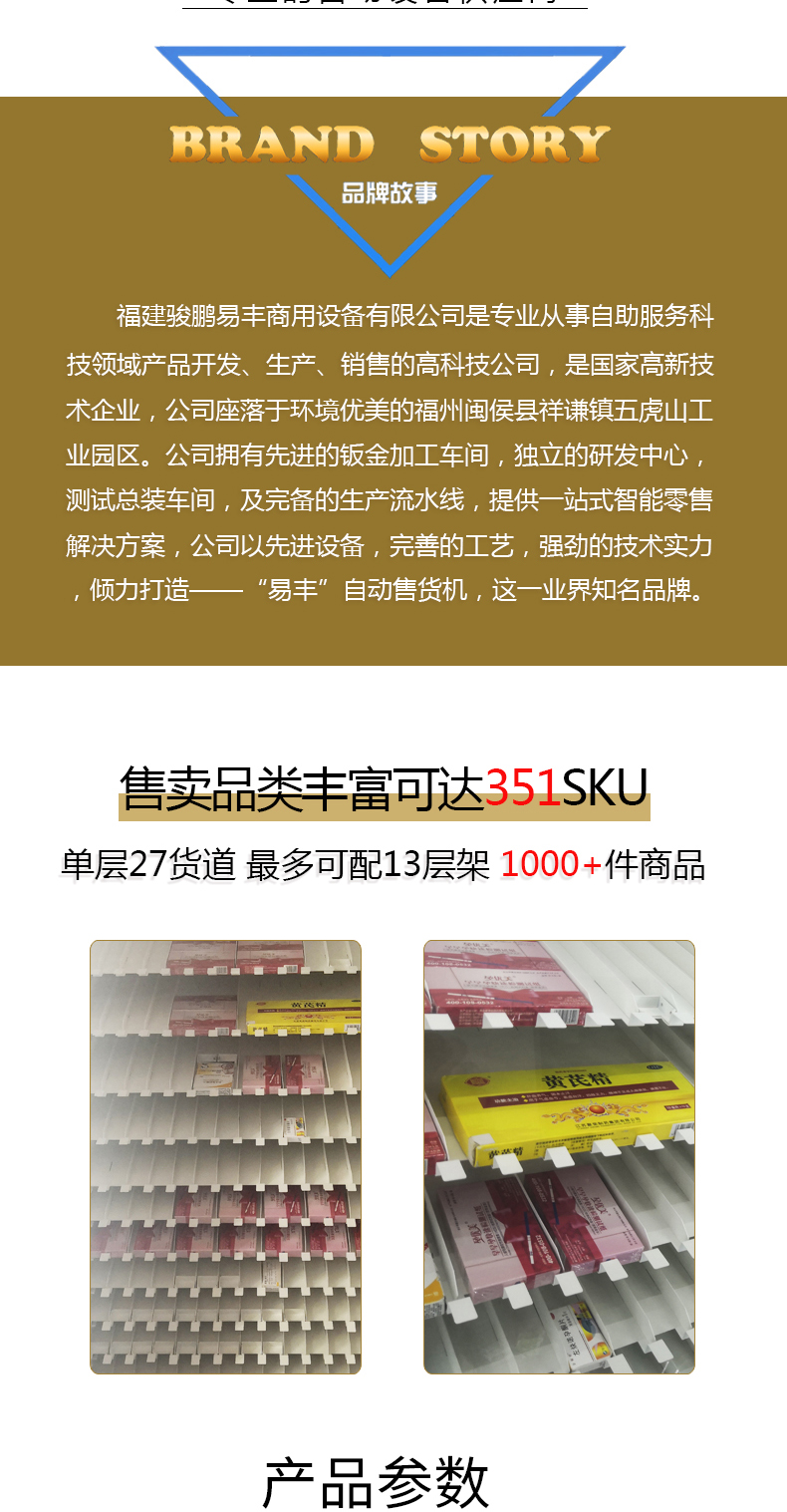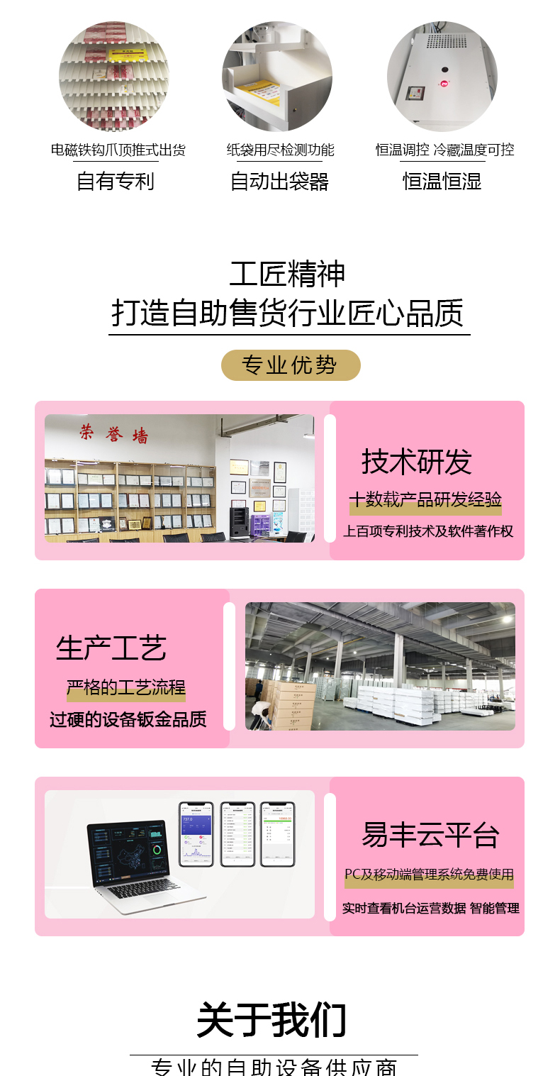 新款易丰EV7789SY-10ET2是一款多功能智能自动售药机,采用智能化管理系统,可轻松设定商品销售价格,具备故障自诊断等管理功能,方便运营用户使用。