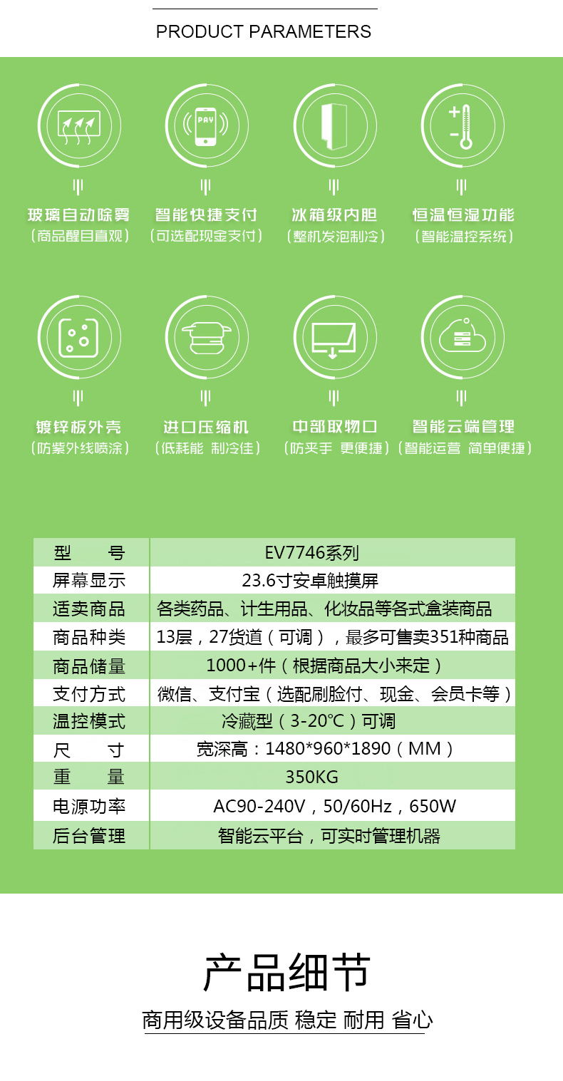 产品型号:EV7736SY-10CT智能药品自动售货机,全新顶出式货道设计,掉落式出货,114大容量货道(货道大小可调)23.6寸安卓触屏,适合售卖非处方药、保健品等商品(药品)