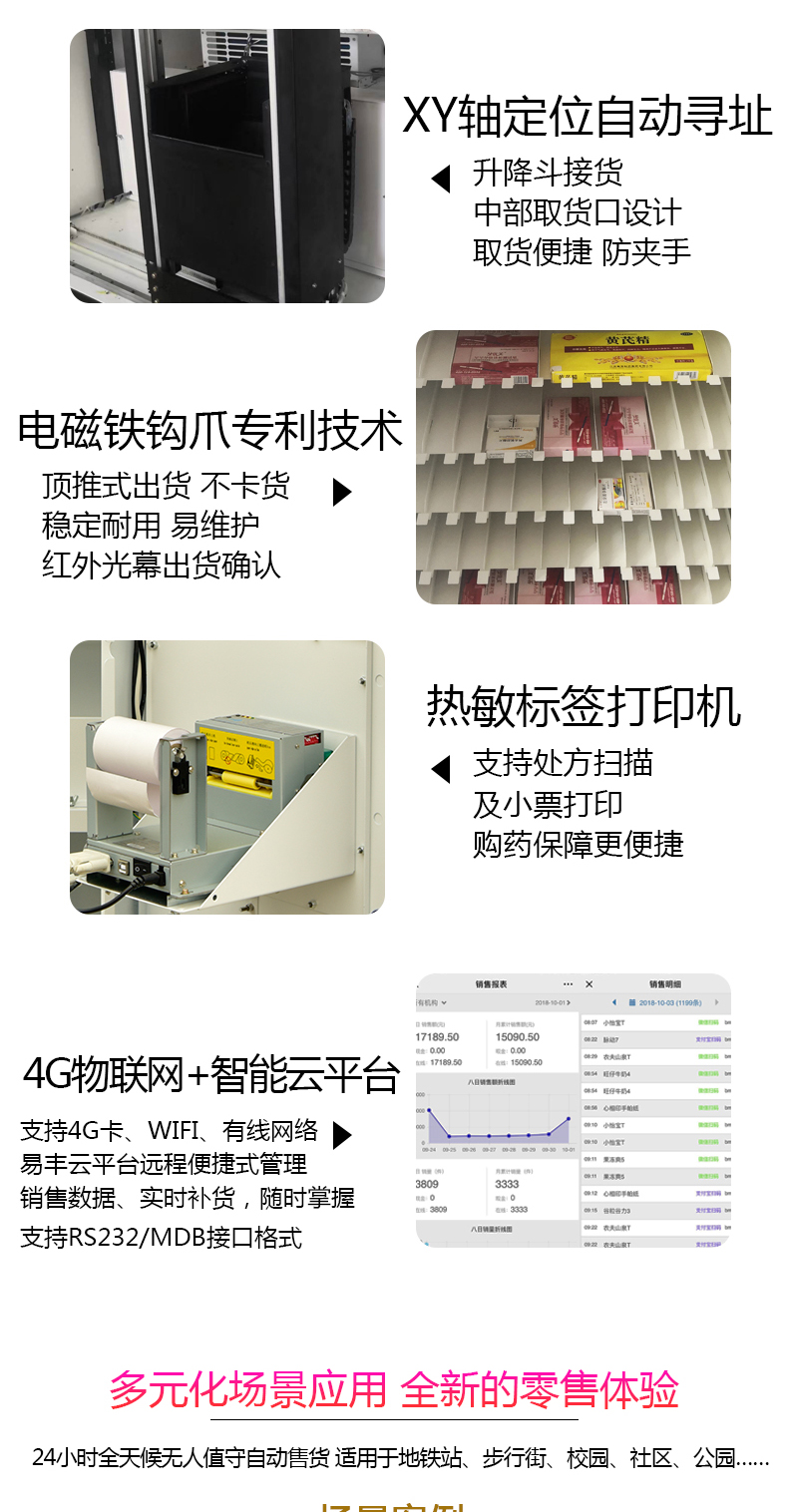骏鹏易丰定制款自动售药机产品特点:滑落式货道设计,掉落式出货,不卡货,恒温恒湿系统,可根据客户需求定制, 支持售卖各类药品、计生用品、化妆品等各式盒装商品