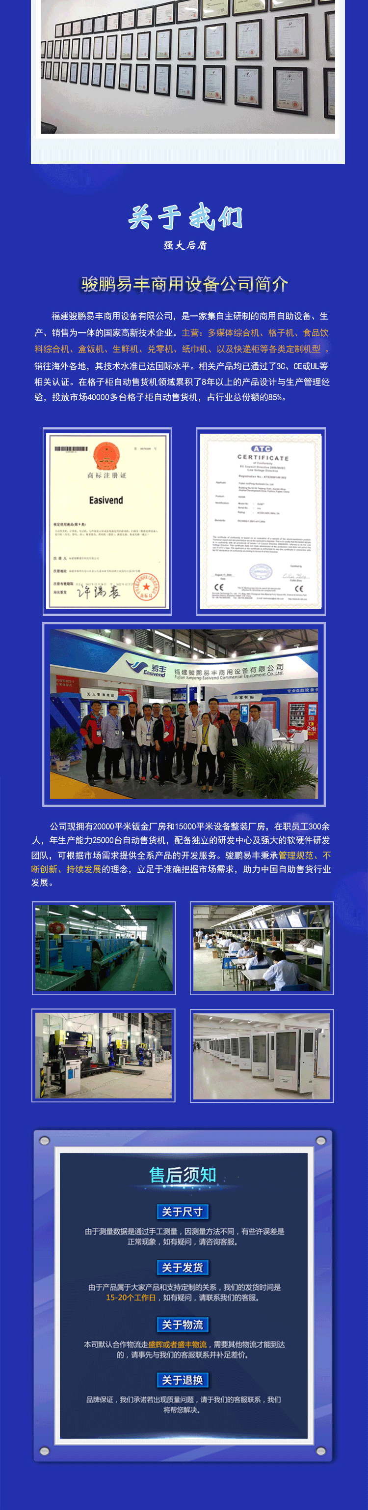 作为格子柜自动售货机的鼻祖,骏鹏易丰深耕格子机研发生产二十余载,软硬件技术成熟,设备经久耐用,产品远销全球五十多个国家和地区。